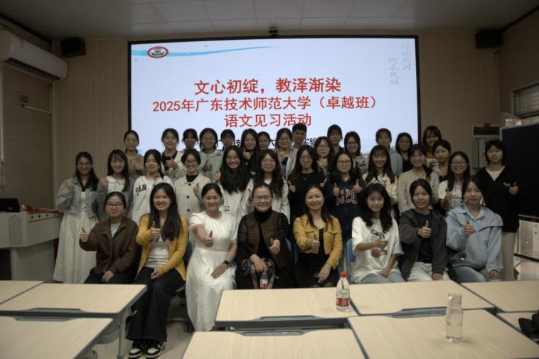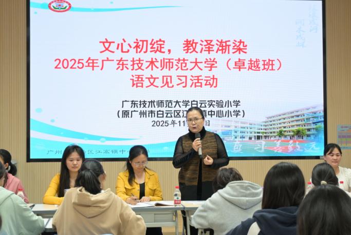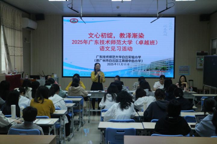 为进一步培养我校汉语言文学(师范)专业卓越班学生教育实践能力,2025年11月11日下午,广东技术师范大学文学与传媒学院曾洁教授带领2023级中师卓越班34名学生,赴广东技术师范大学白云实验小学(原江高镇中心小学)开展以“文心初绽,教泽渐染”为主题的教育见习活动。白云实验小学教导处沈主任、各年级语文科组长出席了此次见习活动。
