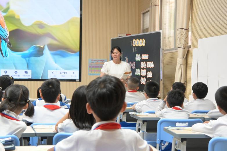 此次活动以课堂观摩、座谈研讨等形式,让卓越班的同学近距离感受小学教育教学实况,收获了宝贵的教学指导与建议。首先,卓越班师生在阶梯教室观摩了陈美兰老师讲授的三年级语文上册第五单元《搭船的鸟》示范课。陈老师以该习作单元的核心目标开篇,从标题中“搭”字含义入手,播放课文朗读音频帮助学生把握节奏、认准字音;引入“翠鸟”资料链接,分析“翠”与“羽”字的书写差异,通过书写练习帮学生规避错字。随后,以任务驱动让学生通读课文认读字词、辨析多音字“啦”,结合插图穿插问答与小练笔进行巩固;再引导学生感知文本,梳理作者的观察对象。接着,指导学生圈画第一段“所见所听”,理解感官观察法;通过小组合作分析第二段翠鸟外形描写,结合板书点明“整体到局部”观察顺序;最后布置相关小练笔作业进行写作训练。整堂课教学活动丰富,学生积极性高,为见习的卓越班同学呈现了一堂扎实高效的小学语文示范课。