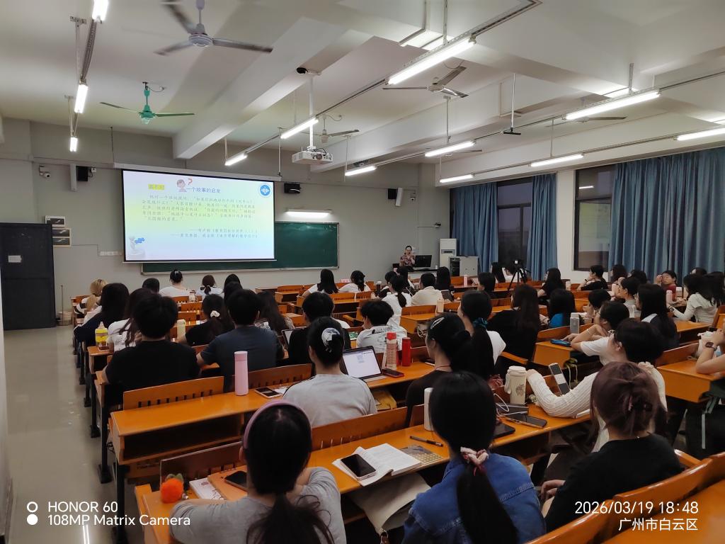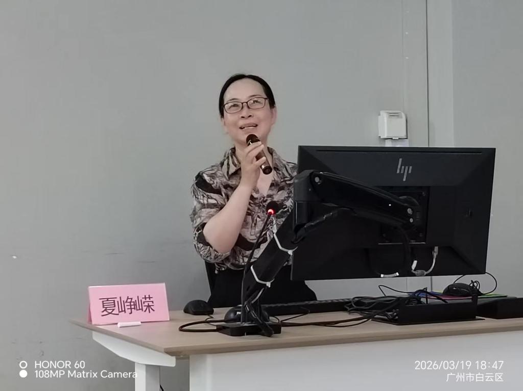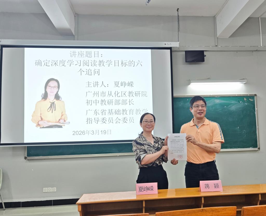 2026年3月19日18:40-20:40,应广东技术师范大学文学与传媒学院(以下简称“广师大文传学院”)邀请,广州市从化区教育研究院正高级语文教研员夏峥嵘老师(以下简称夏老师)在广师大白云校区第三教学楼303教室为文传学院2025级学科语文研究生及2023、2024级汉语言文学师范卓越班学生举办了题为“确定深度学习阅读教学目标的六个追问”的讲座。讲座由文传学院“语文教育前沿讲座”负责人蒋颖老师主持。