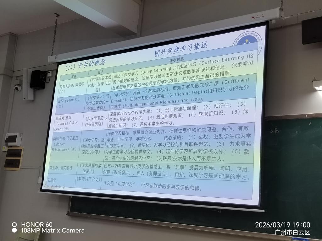讲座伊始,夏老师通过杜威的故事作为引入,提出“思维是教育的炼金术”的观点并点明了深度学习的必要性。紧接着,夏老师紧扣“深度学习”这一关键词,梳理国内外相关理论,从“相对的概念”“开放的概念”和”动态的概念“三个维度,帮助同学们更为深刻地理解“深度学习”的内涵。