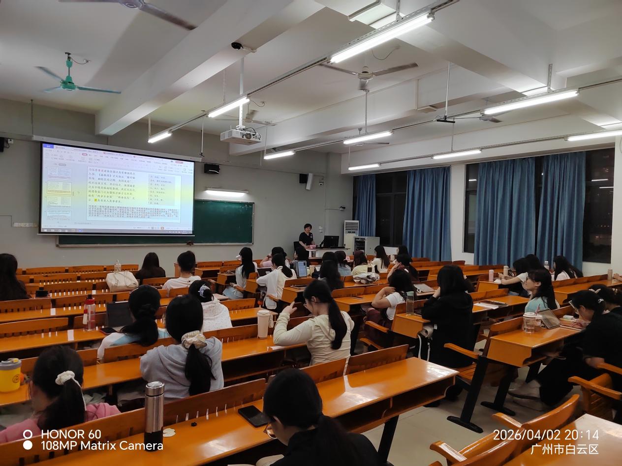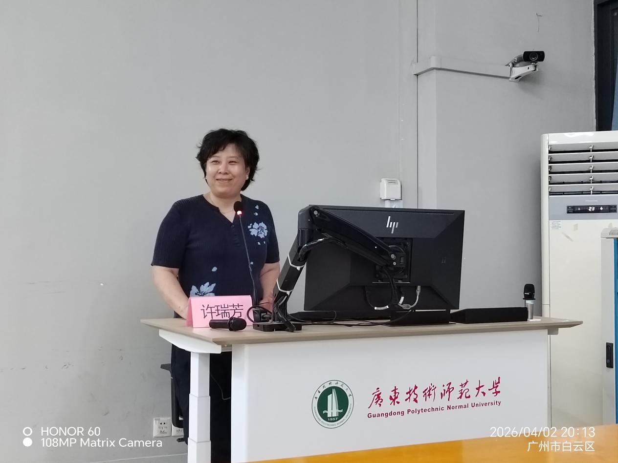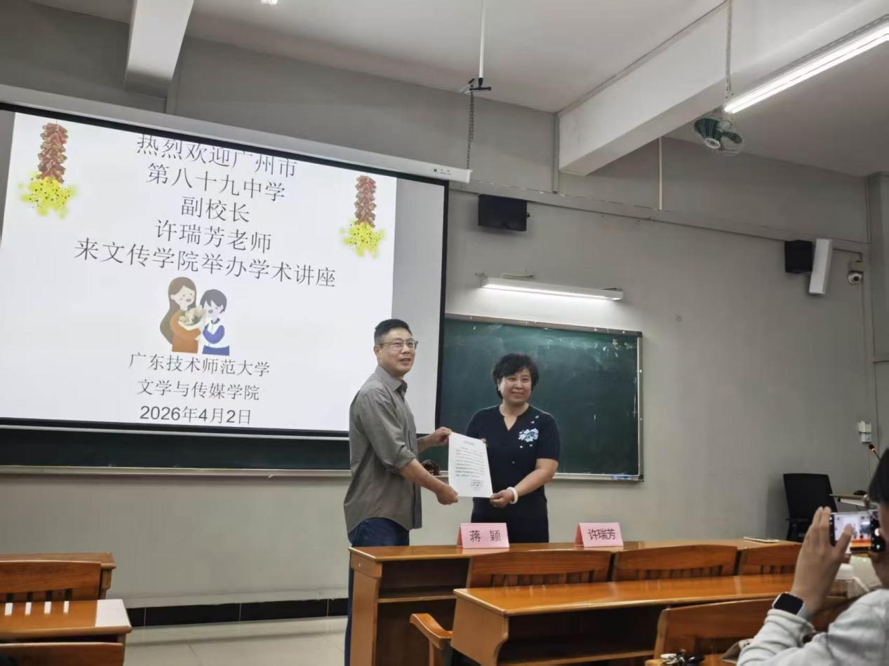 2026年4月2日18:40-20:40,应广东技术师范大学文学与传媒学院(以下简称“广师大文传学院”)邀请,广州市八十九中许瑞芳副校长在广师大白云校区第三教学楼303教室为文传学院2025级学科语文研究生及2023、2024级汉语言文学师范本科卓越班学生举办了题为“语文教学视域下的语境理解及评价”的学术讲座。讲座由文传学院学科语文研究生“语文教育前沿讲座”负责人蒋颖老师主持。
