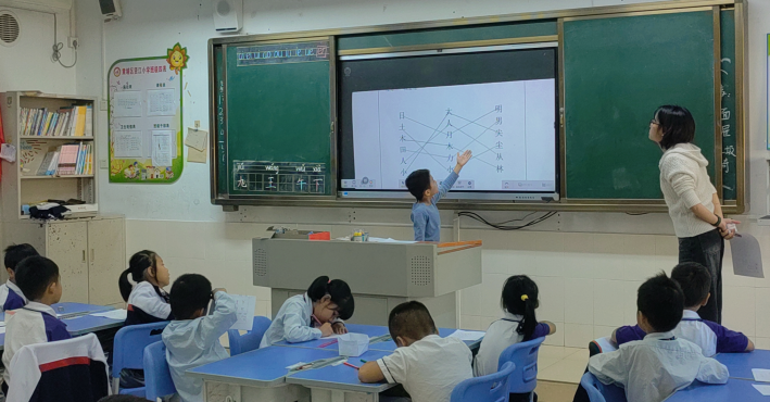 早上8点,广师大文传学院中期检查小组秦绿叶老师一行到达贤江小学,与校内指导教师郑凯钟校长、吴彦蓉老师、刘淑娟老师、刘玉婷老师以及实习生华金凤、葛炜琦、冷欣来到一年(2)班听汇报课。来自2022级中师(2)班实习生欧文晓给一年级的学生上了一堂主题为《日月明》语文课。课堂上,欧文晓同学以驱动任务为核心,搭配趣味互动游戏与创意教学设计,带领学生感受合体字的独特魅力,充分激发了孩子们的语文学习兴趣。整堂课巧妙运用多媒体教学手段,融入现代教学理念,生动展现了师范生的教学创新力与实践能力。