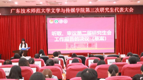 会议进入第二阶段,代表们听取并审议了《广东技术师范大学文学与传媒学院研究生会章程》。随后,第二届研究生会主席团成员郭颖茵向大会作第二届研究生会工作报告,全面回顾了过去一年在思想引领、学业发展、校园文化和自身建设等方面取得的显著成果。经审议,大会一致通过了《关于广东技术师范大学文学与传媒学院第二届研究生会工作报告的决议(草案)》。决议充分肯定了第二届研究生会的工作,认为报告内容全面、客观,并明确提出了未来的发展方向。大会号召全院研究生牢记“文以载道,传之千里”的学院精神,锐意进取,为实现中华民族伟大复兴的中国梦贡献青春力量。