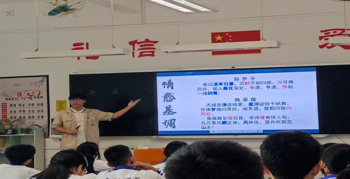 上午9:45,赵越一行听了实习生冯蒋健给八年级(3)班全体学生讲授的“以舟载情,渡我易安”古典诗词联读汇报课,深入剖析了作者不同时期作品的迥异风格及作品与作者人生境遇的紧密关联,视野开阔,分析引人入胜。