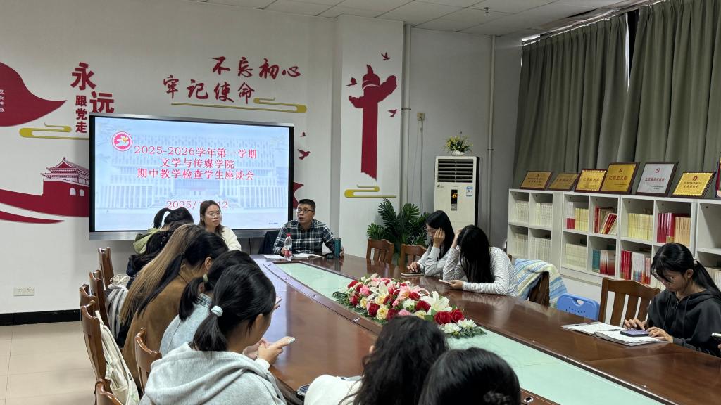 为构建学院与学生间的交流纽带,了解学生需求,汇聚真实反馈,完善教学资源配置,促进师生工作高质量发展,按照学校规定,文学与传媒学院于2025年11月12日在白云校区一教425会议室召开期中教学检查学生座谈会。文学与传媒学院副院长佘爱春,教务员石国燕老师以及白云校区23、24级各班学委参加了这次座谈会。