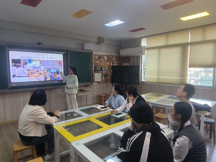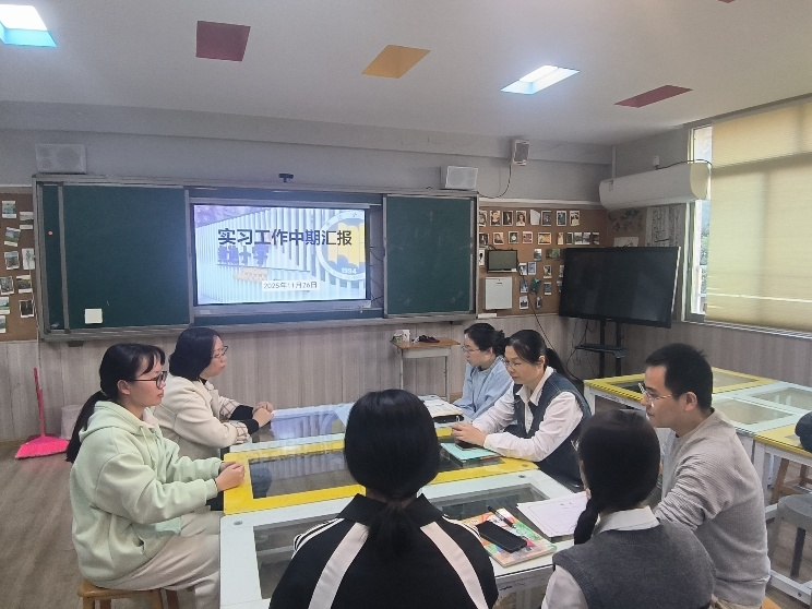 其次,实习生郭小萍作实习工作中期汇报。她从学校领导重视、教育教学实习培养模式、实施进度、后期规划等方面展开介绍,图文并茂地展示了实习生丰富多彩的日常工作与生活——包括听课学习、公开课教学、课堂教学实践,以及参与学校研学、运动会、消防演练、班级文化活动等多项内容,还涉及学生午休管理、作业批改等细致工作。她在总结中说道:“指导老师全程投入,耐心指导,细致关怀,践行教学相长。实习生全程参与学校教学活动,沉浸式融入教育教学管理,努力实现从学生到教师角色的蜕变。”并对下一阶段的教育教学实践作出展望。