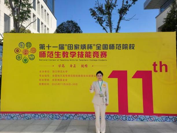 2025年11月28日至11月30日,第十一届“田家炳杯”全国师范院校师范生教学技能竞赛总决赛在浙江师范大学举行。我校文学与传媒学院2022级汉语言文学(师范)卓越班张舒庭在全国众多参赛选手中脱颖而出,荣获汉语言文学组二等奖。
