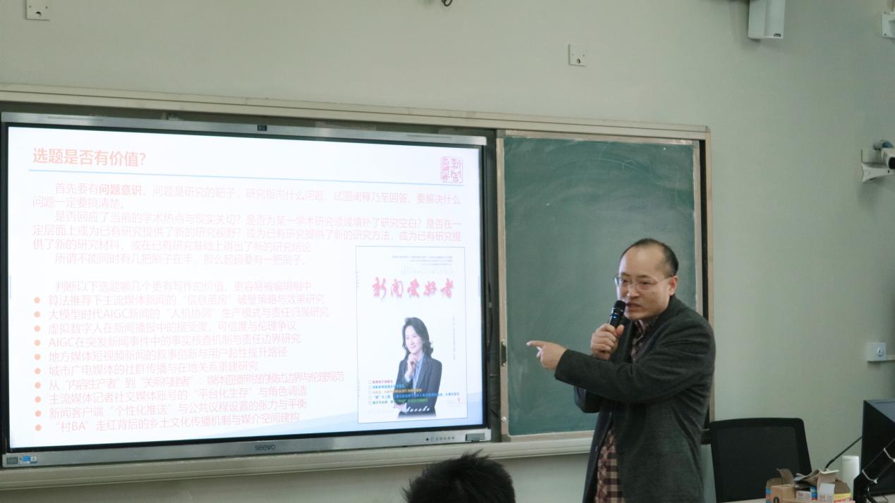 孙勇从学术论文的“问题意识”切入,指出“题好文一半”是论文成功的基石。他强调,选题必须回应学术脉络与现实关切,兼具理论价值与实践意义,并可通过填补空白、拓展视角、创新方法等路径实现突破。选题来源则应扎根现实生活与传播实践,注重与既有理论对话,在前人研究基础上寻求深化与超越。