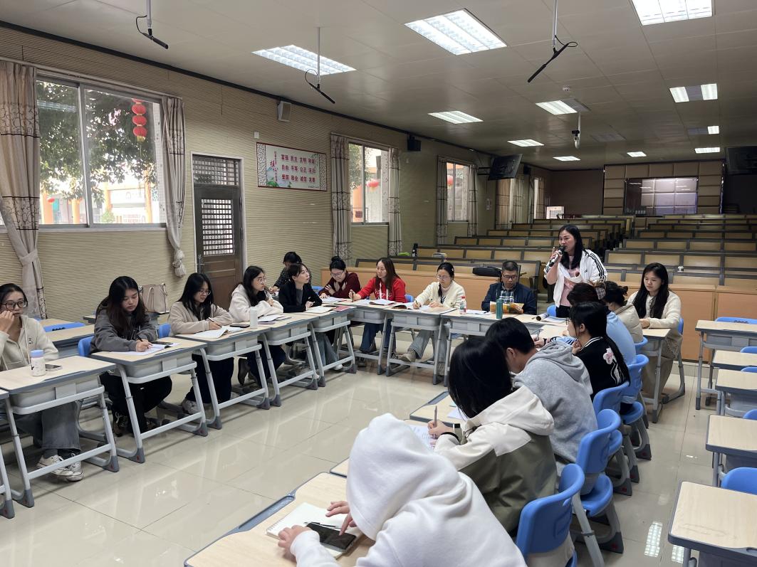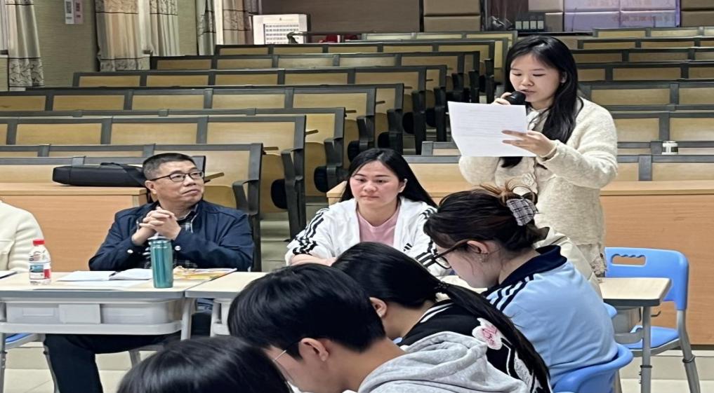 评课环节结束后,由实习生组长吴晓晶进行实习工作中期汇报。吴晓晶介绍了教育教学实习培养模式的“五个一”和“双导师”制,从课堂教学实践、观摩优质课、课外拓展活动、德育实践等方面展示了实习生在实习期间的工作,充分显示出实习生在实习期间的收获与成长。