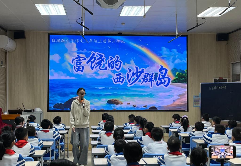 中期检查在三年级6班的汇报课上正式开始。实习生朱颖从“跟着课本去旅行”的情境出发,开始了《富饶的西沙群岛》第一课时教学。汇报课围绕着初识西沙群岛、获取登岛船票、寻找神秘宝藏、做个观光者四个学习任务,从生字认读到整体感知,再到精读具体文本,最后小结作业。课堂设计由浅入深,环环相扣,通过提出“寻找课文关键句”等探究性问题,一步步引导学生自主对课文进行深入探索,并开展小组讨论活动。课堂上,学生积极回答问题,反应热烈,课堂氛围持续高涨。最后,课堂在学生的书写生字中顺利结束。