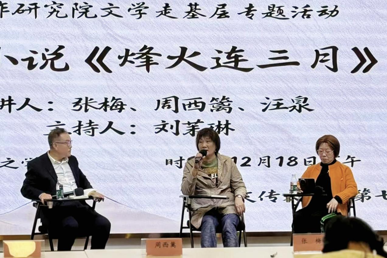 12月18日下午,由广州文学艺术创作研究院及我院共同主办的“文学走基层”专题讲座在我校白云校区图书馆达之学堂成功举办。本次活动作为“文传大讲堂”第七十八讲,特邀广州文学艺术创作研究院原院长、广东省作协原副主席、一级作家张梅,围绕其最新长篇力作《烽火连三月》进行专题分享。知名作家、评论家汪泉、周西篱作为对话嘉宾出席活动。讲座由我院刘茉琳副院长主持。