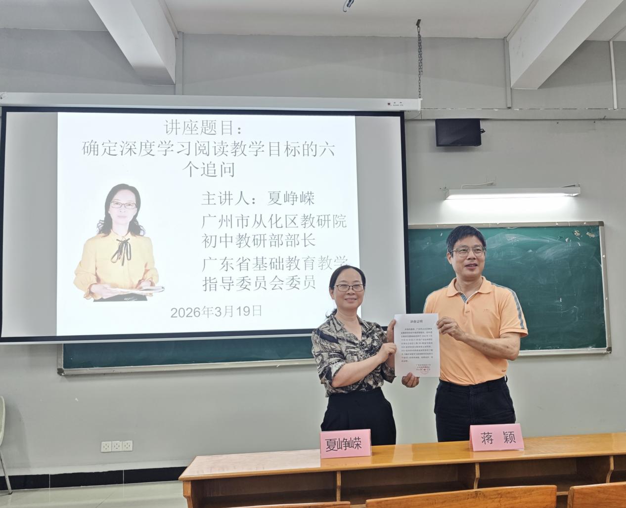 2026年3月19日18:40-20:40,应广东技术师范大学文学与传媒学院(以下简称“广师大文传学院”)邀请,广州市从化区教育发展研究院初中教研部部长、初中语文教研员夏峥嵘老师在广师大白云校区第三教学楼303教室为文传学院2025级学科语文研究生及2023、2024级汉语言文学师范本科卓越班学生举办了题为《确定深度学习阅读教学目标的六个追问》的学术讲座。讲座由文传学院学科语文研究生“语文教育前沿讲座”负责人蒋颖老师主持。