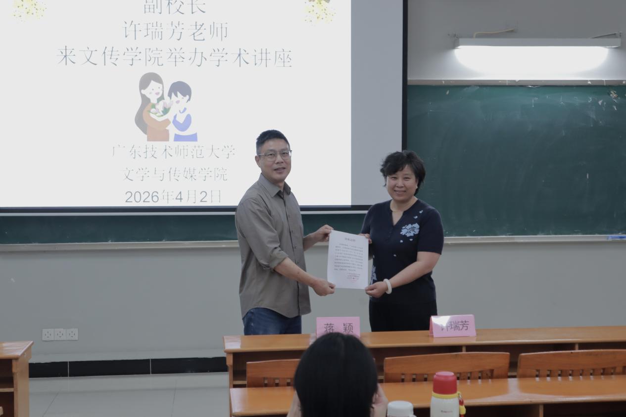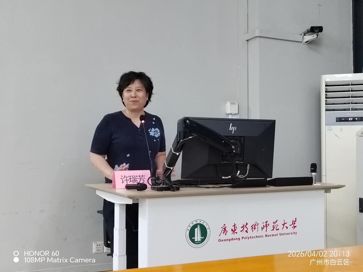 2026年4月2日18:40-20:40,应广东技术师范大学文学与传媒学院(以下简称“广师大文传学院”)邀请,广州市第八十九中学副校长、教育部新时代中小学学科师范领军教师许瑞芳老师在白云校区三教303教室,为学院师生带来了一场题为《语文教学视域下的语境理解及评价——基于近三年全国卷试题深度解析》的语文教育前沿讲座。讲座由文传学院蒋颖老师主持,2025级学科教学(语文)专业研究生、2024级与2023级中师卓越班同学共同参与。