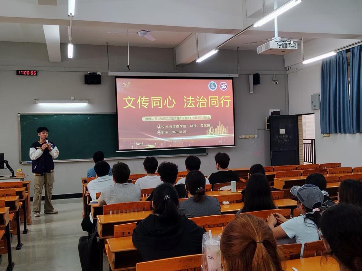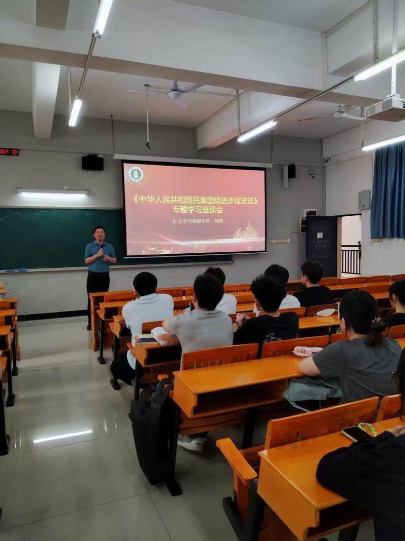 4月7日,文学与传媒学院召开《中华人民共和国民族团结进步促进法》专题学习分享会,学院党委副书记林庆、专职辅导员周汉阳及部分学生代表参会。