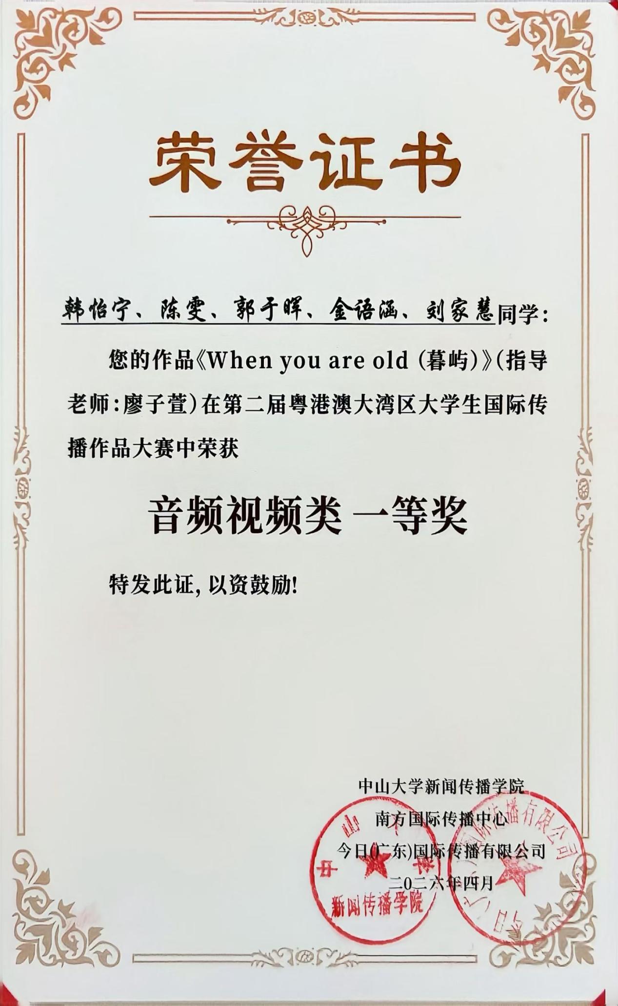 近日,第二届粤港澳大湾区大学生国际传播作品大赛的获奖结果正式揭晓。我院广播电视编导专业的韩怡宁、陈雯、郭于晖、金语涵、刘家慧五位同学,在廖子萱老师的指导下,凭借微纪录片《暮屿》在全国众多参赛作品中脱颖而出,荣获音频视频组一等奖,充分展现了我院学子在国际传播创作领域的创新能力与专业素养。
