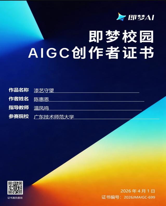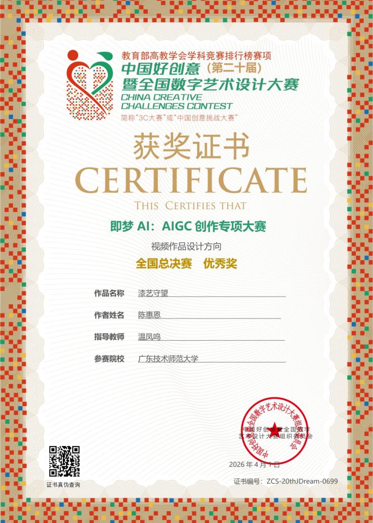 近日,第20届中国好创意暨全国数字艺术设计大赛——即梦AI:AIGC创作专项赛获奖结果正式公布。我院网络与新媒体专业24网媒2班陈惠恩同学在温凤鸣老师指导下,凭借原创AI短片作品《漆艺守望》从全国众多参赛作品中脱颖而出,荣获国赛优秀奖,展现出我院学子在AIGC影视创作领域的创新实力与专业素养。