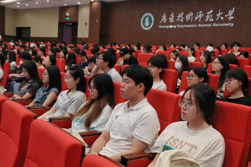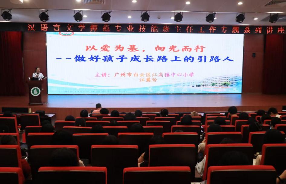 4月17日下午,文学与传媒学院2026年汉语言文学专业师范技能之班主任工作专题系列讲座在白云校区图书馆一楼报告厅拉开序幕。广州市名班主任、白云区江高镇中心小学副校长江慧玲老师为我院师生作了《以爱为基,向光而行》专题讲座。讲座由文学与传媒学院副院长佘爱春主持,2023级汉语言文学(师范)专业本科生和学科教学(语文)研究生近三百名学生到场聆听学习。