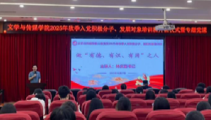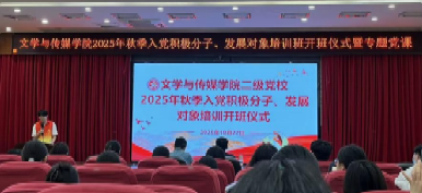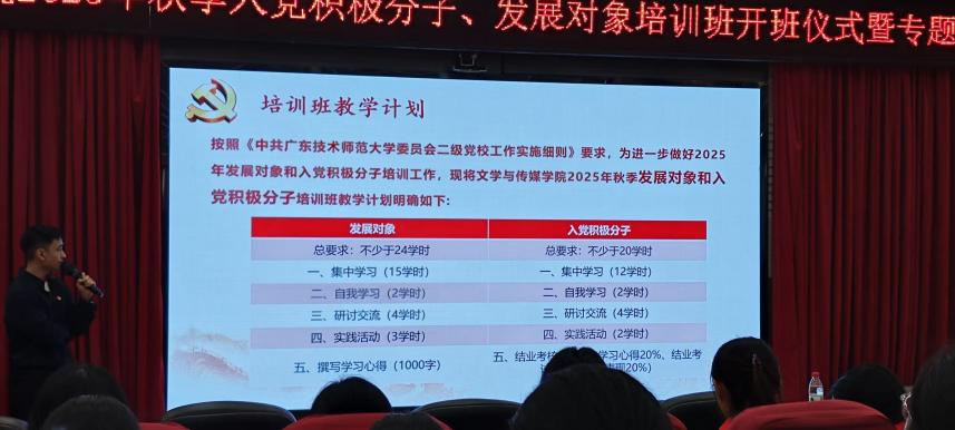 为深入学习贯彻习近平新时代中国特色社会主义思想,落实新时代党的战略部署总要求,筑牢入党积极分子与发展对象思想根基与理论基础,10月27日,文学与传媒学院在白云校区三教104报告厅举办2025年秋季入党积极分子、发展对象党校培训班开班仪式,并邀请学院党委副书记林庆讲授专题党课。此次会议由周汉阳老师主持,全体入党积极分子和发展对象参加了本次会议。