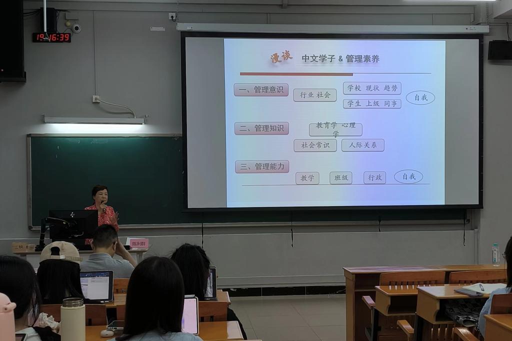 随后,陈教授以事例来说明中文人提升管理素养的重要性。陈教授以亲身经历告诉同学们“中文专业与管理存在内在逻辑,中文人在管理领域拥有内在文学底蕴与情怀”,向同学们说明了中文与管理的内在关系。当前教育界对教师的要求很高,中小学缺少组织文体活动、运营公众号等能够兼顾教学与管理的人才,陈教授指出“中文人要注重管理意识的培养,让自己成为教学+管理的优秀教师”。接下来,陈教授从管理意识、管理知识和管理能力三方面来讲述管理素养,围绕“中文学生在教育行业应该关注什么”来展开。她提到了宏观意识、懂人、社会常识、人际交往等关于管理素养的知识。