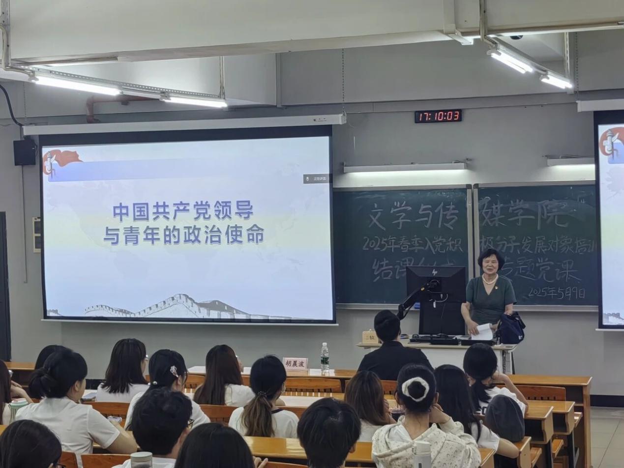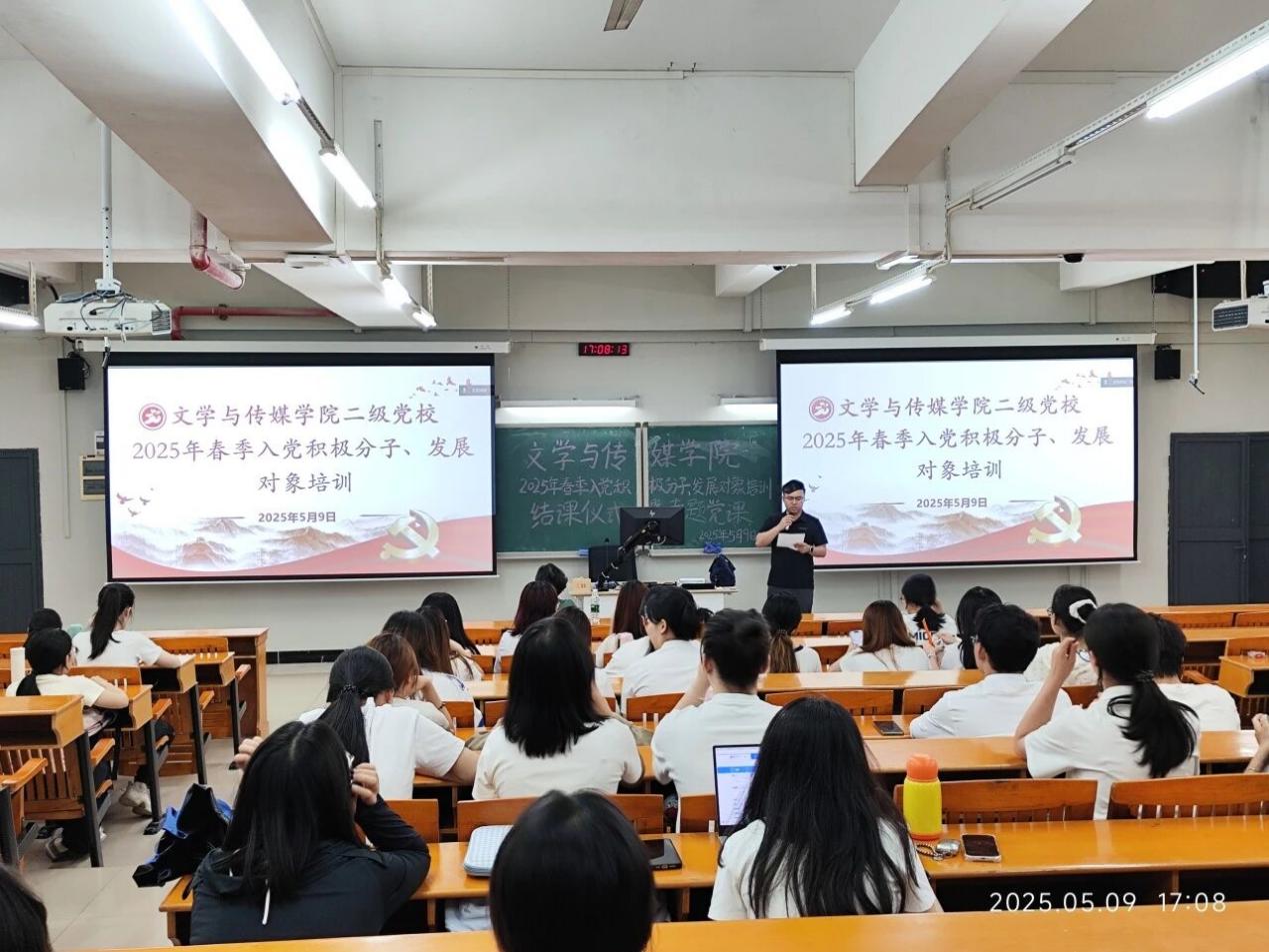为深入学习贯彻全国两会精神,强化入党积极分子和发展对象的党性修养,夯实理想信念根基,5月9日下午,文学与传媒学院在白云校区第三教学楼209教室举办2025年春季入党积极分子与发展对象培训班结业仪式,并邀请胡晨波老师讲授专题党课。会议由戴诚老师主持,全体入党积极分子和发展对象参加了本次会议。此次培训在河源校区通过视频会议的方式同步进行。